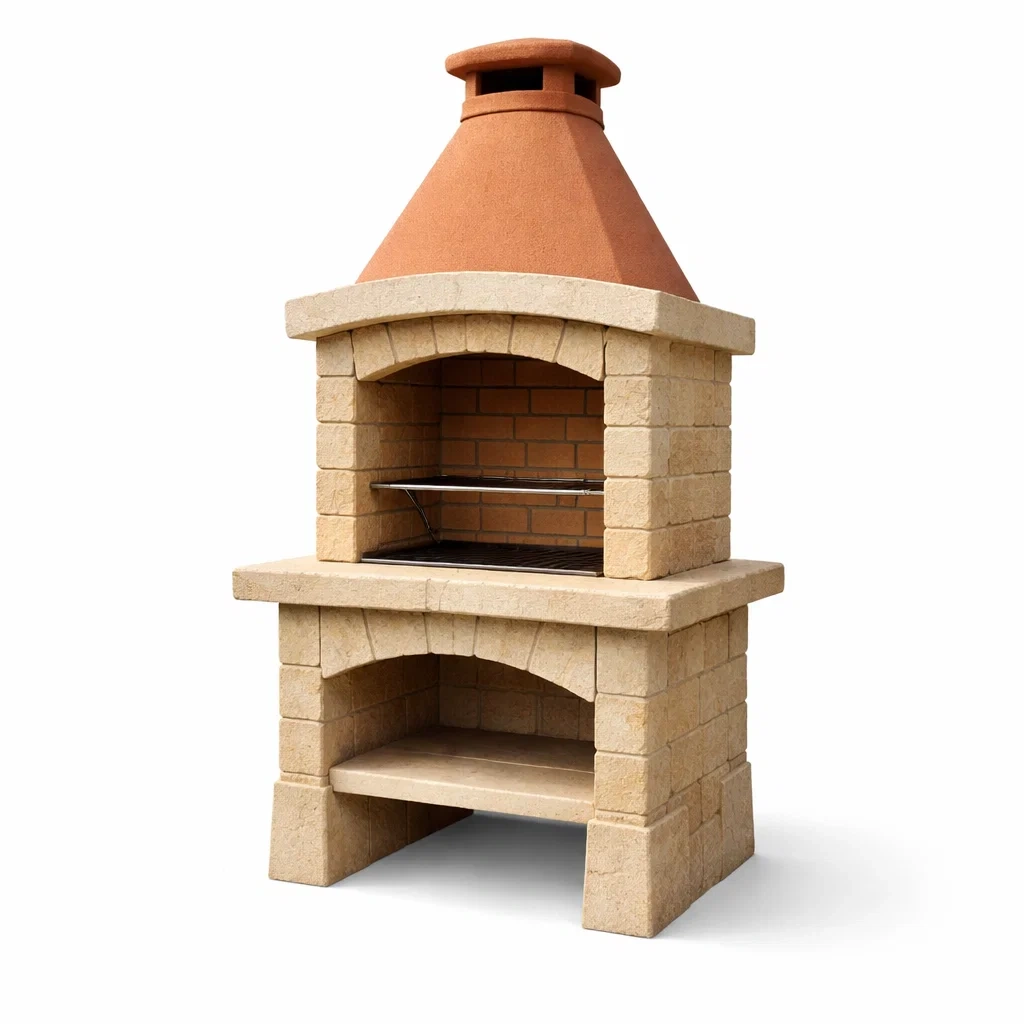 Barbecue da giardino in cemento refrattario e acciaio inossidabile con camino rosso