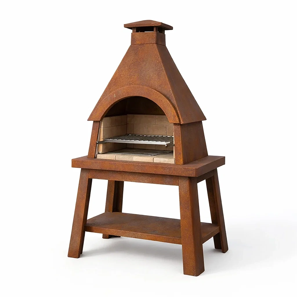 Il forno è realizzato in acciaio Corten, resistente agli agenti atmosferici. La griglia regolabile è in acciaio inossidabile e l'interno è rivestito di mattoni refrattari. Dimensioni complessive di 120x60x200 cm e peso totale di 150 kg.