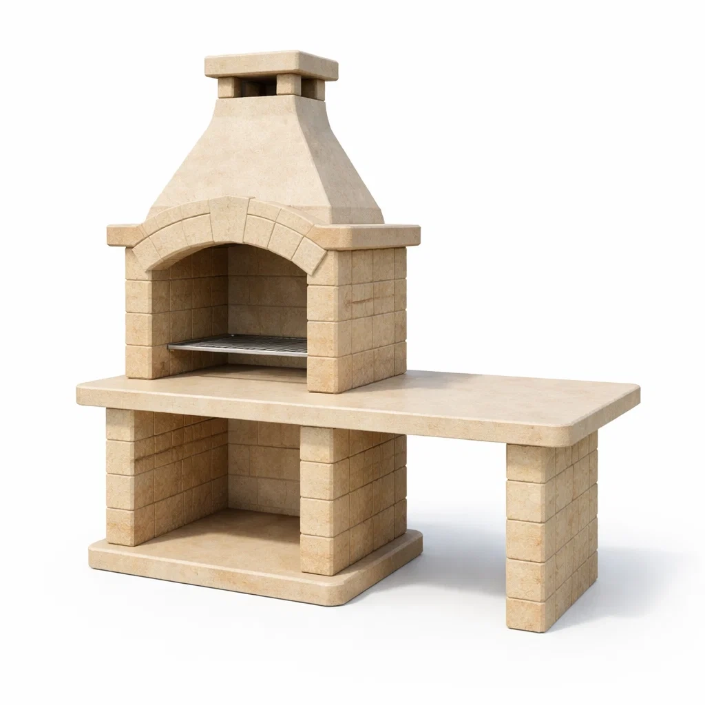 Barbecue realizzato in pietra refrattaria, per ambienti all'aperto. Misura un'altezza totale di 200 cm, con una larghezza di 120 cm e una profondità di 70 cm. Il piano di lavoro integrato è lungo 100 cm. La larghezza interna del forno è di 60 cm. Il peso complessivo è di 350 kg.