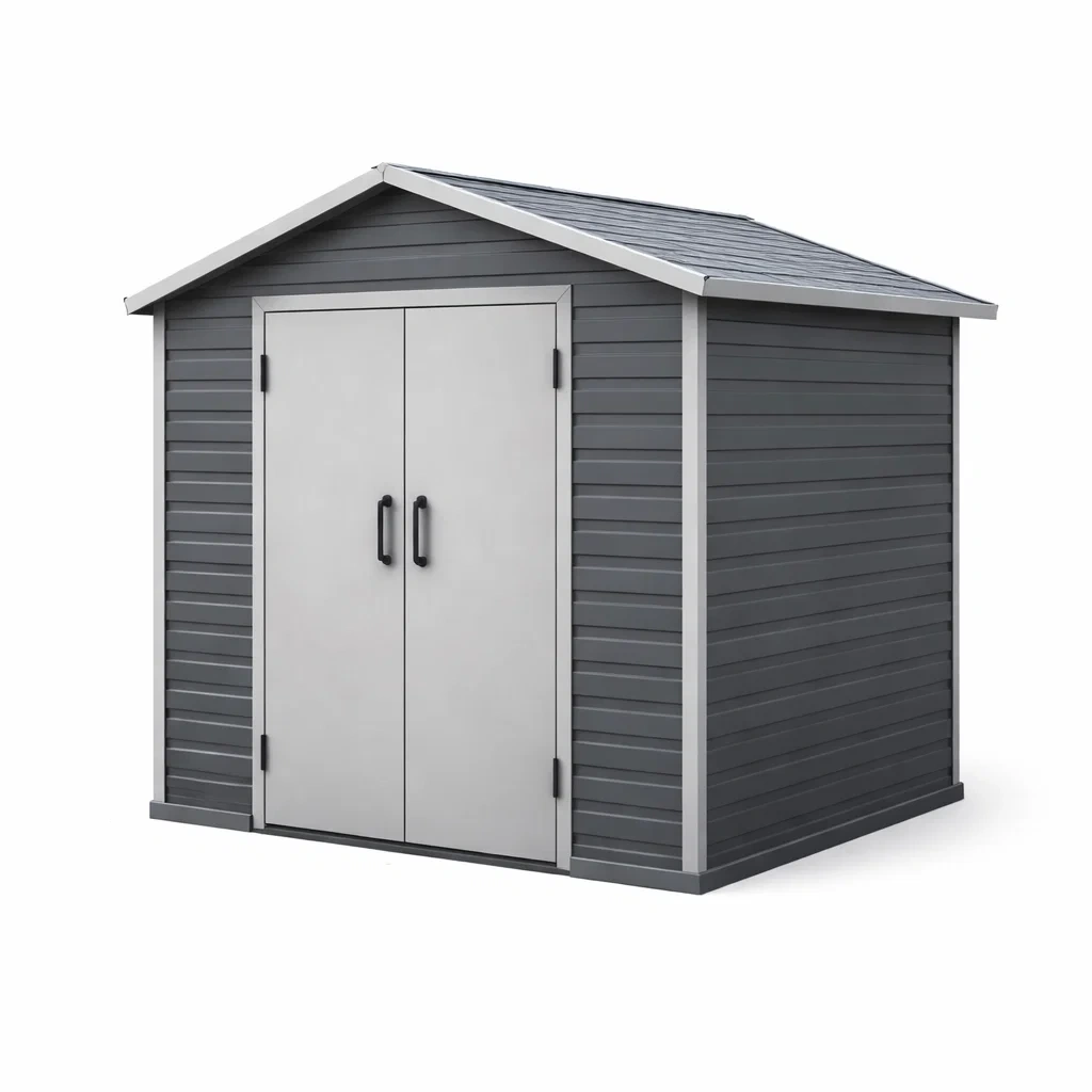 Capanno da giardino realizzato in plastica polipropilene Colore grigio Dimensioni: 182x218x226 cm Struttura resistente Porta doppia con maniglie in metallo verniciato Tetto a doppia falda