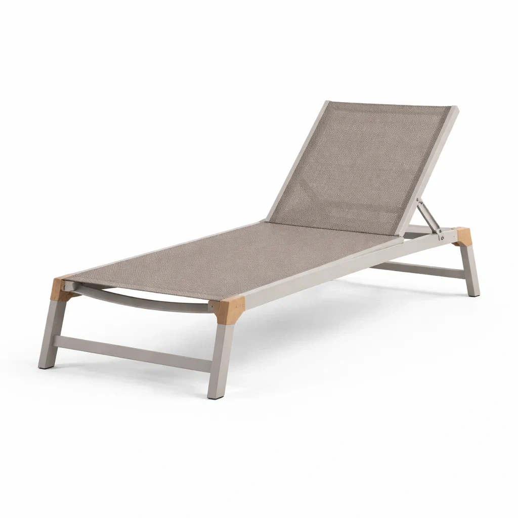Materiale del prodotto: Alluminio, tessuto mesh in poliestere, inserti in legno di teak.