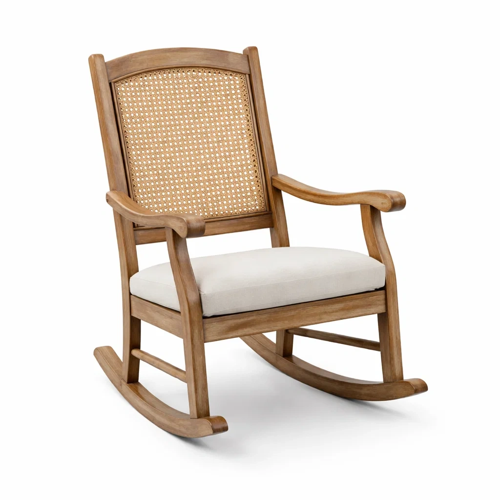 Materiale: Struttura in legno, schienale in rattan intrecciato, cuscino in tessuto di cotone